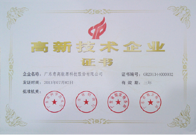 經(jīng)廣東省科技廳、廣東省財政廳、廣東省稅務(wù)局和行業(yè)專家審定,我公司通過了國家高新企業(yè)技術(shù)認證,并于2014年1月22日拿到了《高新技術(shù)企業(yè)》的牌匾和《高新技術(shù)企業(yè)證書》(證書編號:GR201344000032)。